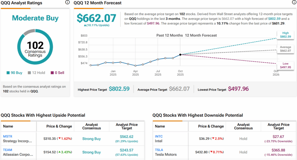월가를 살펴보면, 애널리스트들은 지난 3개월간 90개 매수, 12개 보유, 0개 매도 의견을 바탕으로 QQQ 주식에 대해 보통매수 합의 등급을 부여했다. 또한 QQQ 평균 목표주가는 주당 662.07달러로 10.1%의 상승 여력을 시사한다.