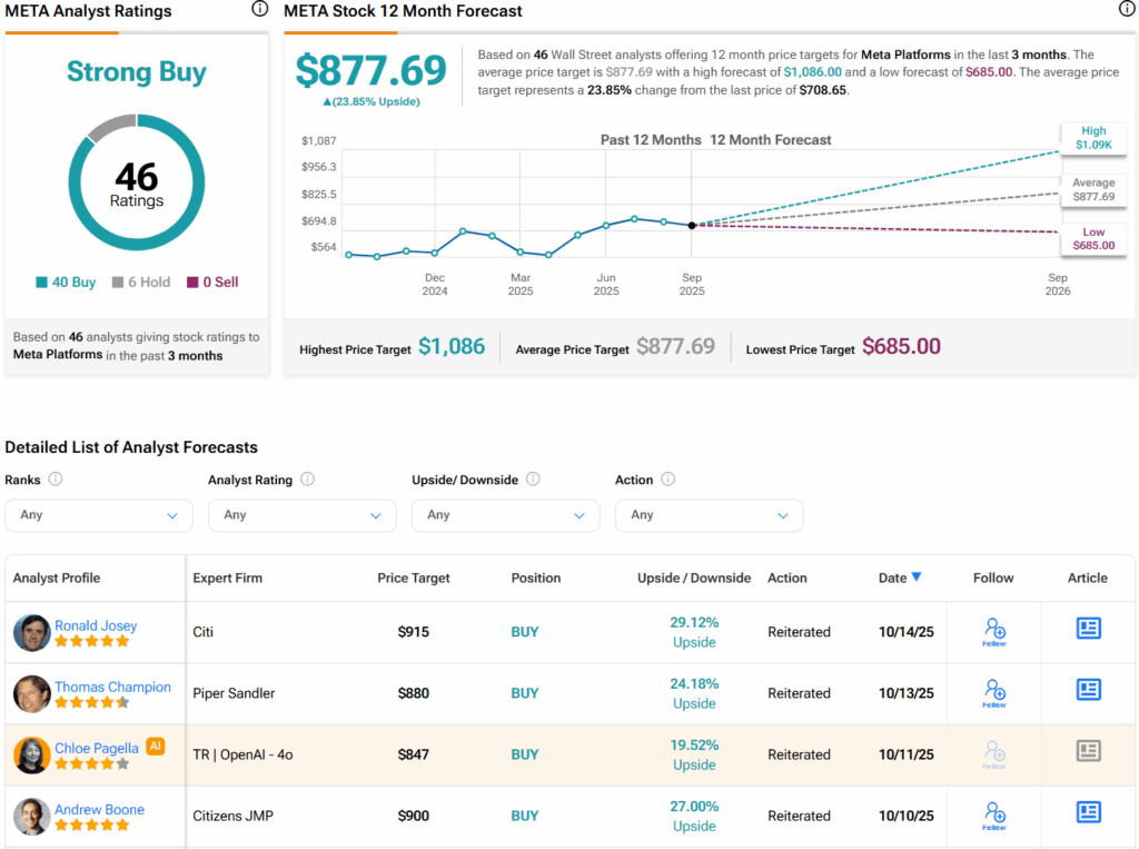 월가를 보면, 애널리스트들은 지난 3개월간 40개 매수, 6개 보유, 0개 매도 의견을 바탕으로 META 주식에 대해 강력 매수 합의 등급을 부여했다. 또한 META 평균 목표주가는 주당 877.69달러로 23.9%의 상승 여력을 시사한다.