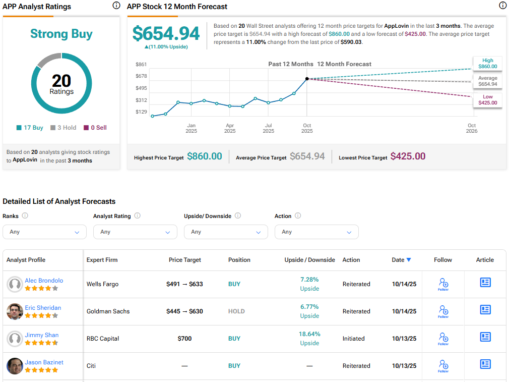 전반적으로 월가는 17개의 매수와 3개의 보유 추천을 바탕으로 앱러빈 주식에 대해 강력 매수 합의 등급을 부여하고 있다. APP 주식의 평균 목표주가 654.94달러는 약 11%의 상승 잠재력을 시사한다.