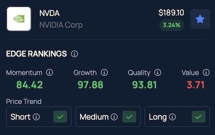 한편 엔비디아는 벤징가의 엣지 주식 순위에서 모멘텀, 성장성, 품질 부문에서 상위권을 기록하며 단기, 중기, 장기적으로 강력한 주가 성과를 보여주고 있다.