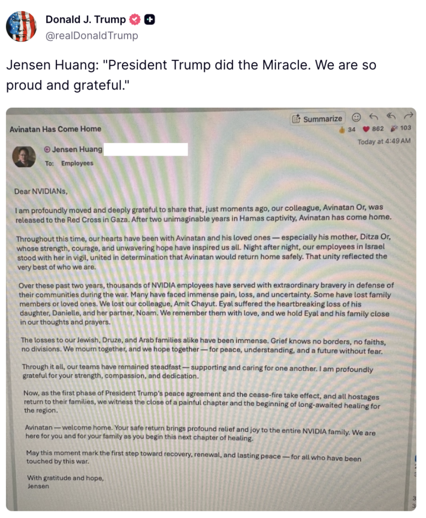 엔비디아(NASDAQ:NVDA)의 젠슨 황 최고경영자(CEO)가 하마스에 2년 이상 억류됐던 이스라엘 엔지니어 아비나탄 오르의 무사 석방을 환영했다.