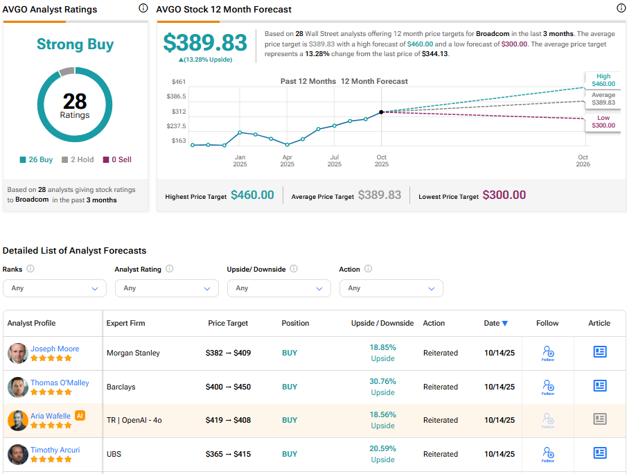 월가 애널리스트들의 의견을 보면, 브로드컴은 28명의 애널리스트 평가를 바탕으로 강력 매수 컨센서스를 유지하고 있다. AVGO 평균 목표주가는 389.83달러로, 현재 주가 대비 13.28%의 상승 여력을 시사한다.