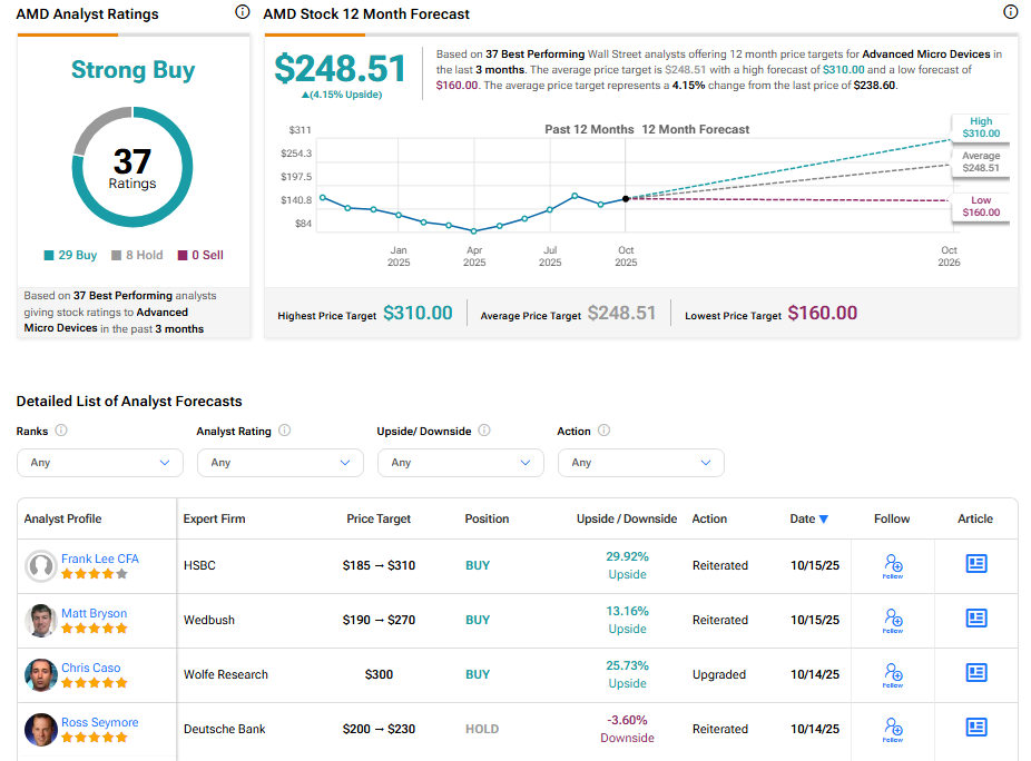 현재 월가는 29개 매수와 8개 보유를 바탕으로 어드밴스드 마이크로 디바이시스 주식에 대해 강력매수 컨센서스 등급을 부여하고 있다. AMD 주식 목표주가 평균인 248.51달러는 약 4.15%의 상승 잠재력을 시사한다.