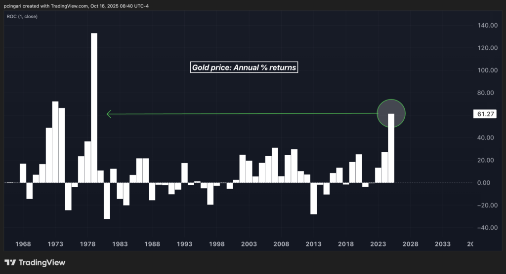 SPDR 골드쉐어스(NYSE:GLD)로 추적되는 금 가격은 목요일 4,250달러까지 상승했다. 연초 대비 60% 이상 상승한 것으로, 1979년 이후 최고의 연간 수익률을 기록할 전망이다. 금은 현재 9주 연속 상승세를 이어가고 있는데, 이는 2020년 8월 이후 가장 긴 연속 상승 기록이다.