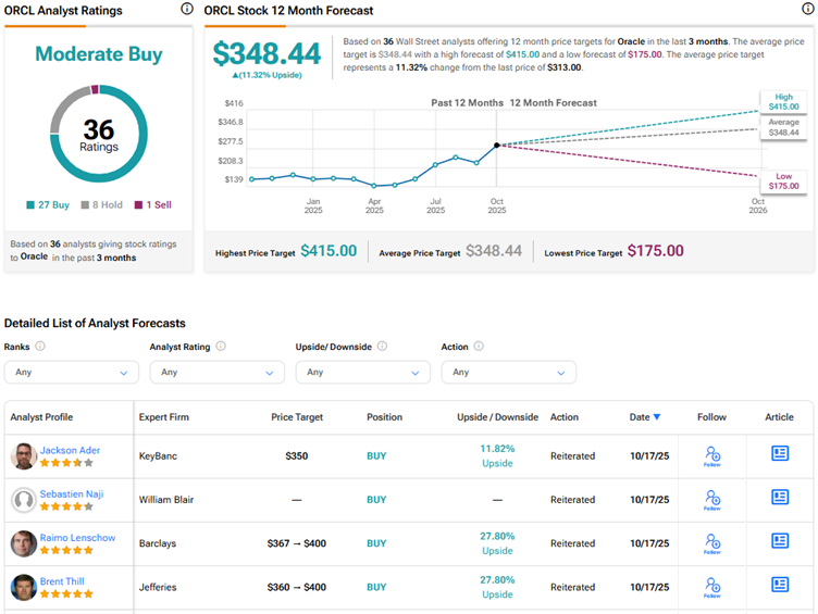 전반적으로 월가는 27개 매수, 8개 보유, 1개 매도 추천을 바탕으로 오라클 주식에 대해 보통 매수 합의 등급을 부여하고 있다. ORCL 주식 평균 목표주가 348.44달러는 11.3% 상승 여력을 시사한다.