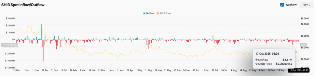 코인글래스의 거래소 데이터에 따르면 시바이누는 목요일 310만 달러의 순유출을 기록했으며, 이는 일주일 연속 자금 유출이 이어지고 있는 상황이다.