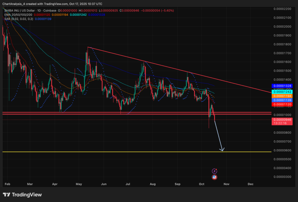 시바이누 가격이 2025년 대부분의 기간 동안 유지되었던 주요 지지선인 0.0000098-0.0000100달러 구간 아래로 하락했다.