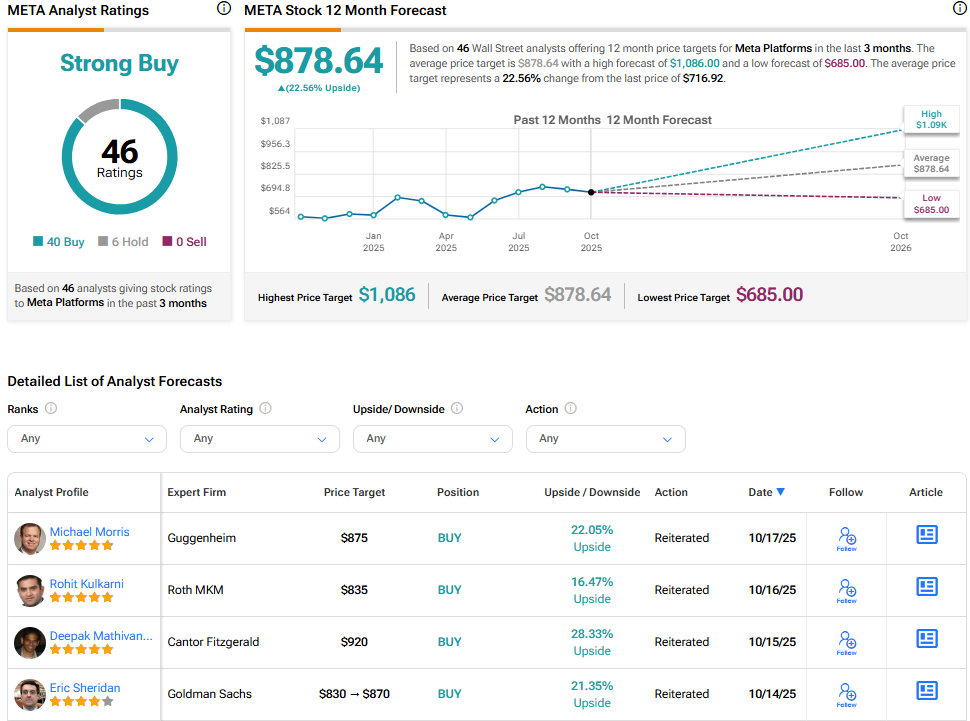 증권가에서 메타는 강력매수 합의 등급으로 애널리스트들의 지지를 계속 받고 있다. META 주식의 평균 목표주가는 878.64달러로, 현재 주가 대비 22.56% 상승 여력을 시사한다.