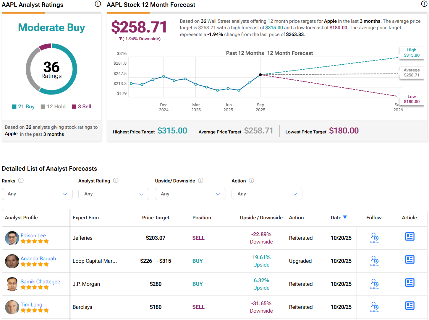 월가를 보면, 애널리스트들은 지난 3개월 동안 21개 매수, 12개 보유, 3개 매도 의견을 바탕으로 AAPL 주식에 대해 보통 매수 합의 등급을 부여했다. 아래 그래프에서 확인할 수 있듯이 말이다. 또한 주당 258.71달러의 평균 AAPL 목표주가는 1.9%의 하락 위험을 시사한다.