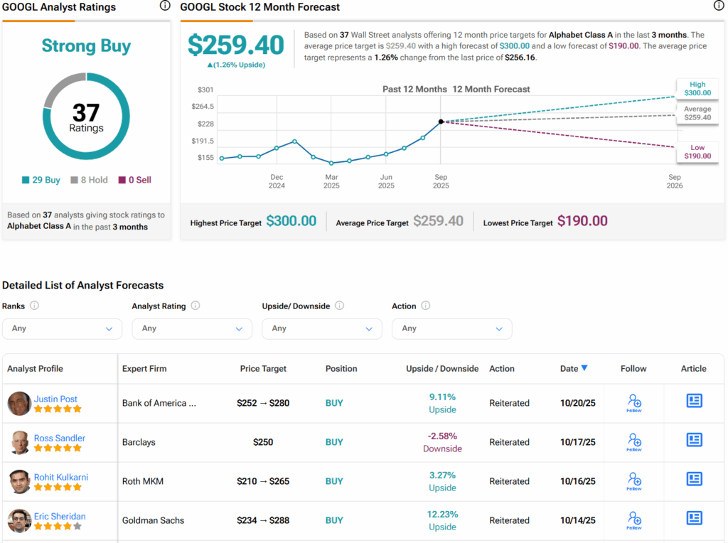 월가를 보면, 애널리스트들은 지난 3개월간 29개의 매수와 8개의 보유 의견을 바탕으로 GOOGL 주식에 대해 강력 매수 합의 등급을 부여했다. 또한 GOOGL 평균 목표주가 259.40달러는 주식이 공정가치 근처에서 거래되고 있음을 시사한다.