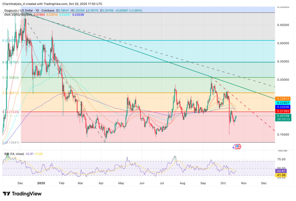 기술적 분석: 도지코인은 0.19달러에서 소폭 반등해 현재 0.201달러에 거래되고 있으나, 상승 모멘텀은 여전히 약세다.