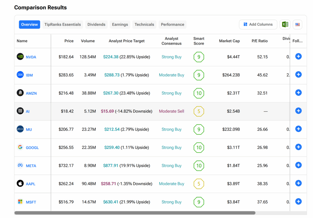 특히 미국에서 AI 인프라에 대한 막대한 투자는 투자자들에게 위험이자 기회를 동시에 제공하고 있다. 팁랭크스의 주식 비교 도구는 여러 월가 애널리스트들의 평가를 바탕으로 어떤 AI 주식이 보유할 가치가 있는지 투자자들에게 가이드를 제공한다. 아래 그래픽을 참조하라.
