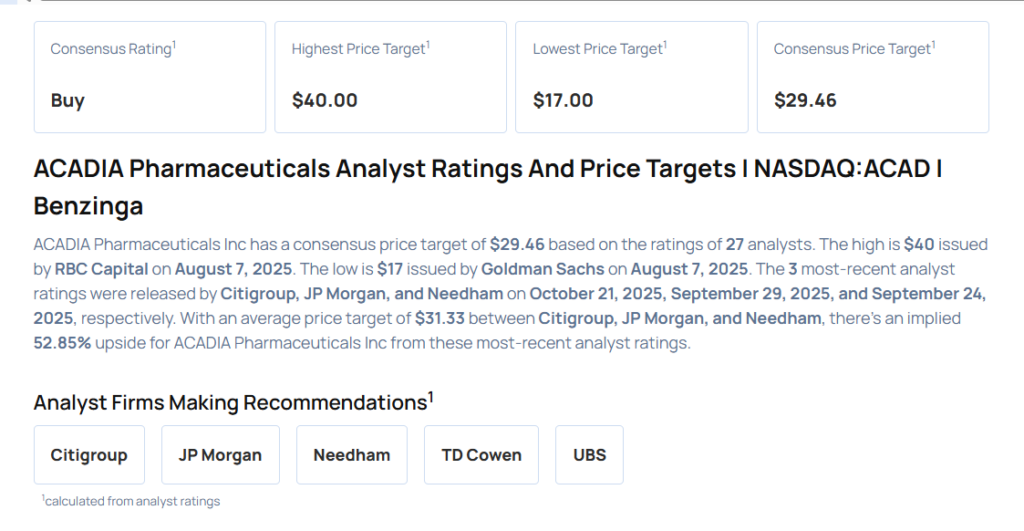 - 시티그룹의 이갈 노초모비츠 애널리스트는 아카디아제약(NASDAQ:ACAD)에 대해 매수 의견과 목표가 33달러를 제시했다. 아카디아제약 주가는 월요일 20.94달러에 마감했다.