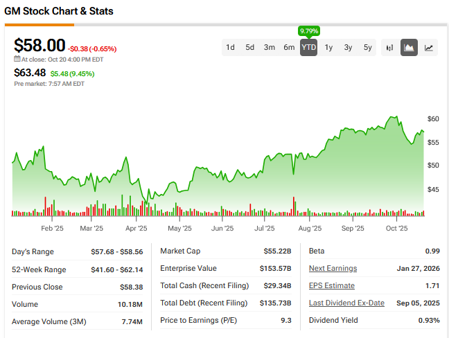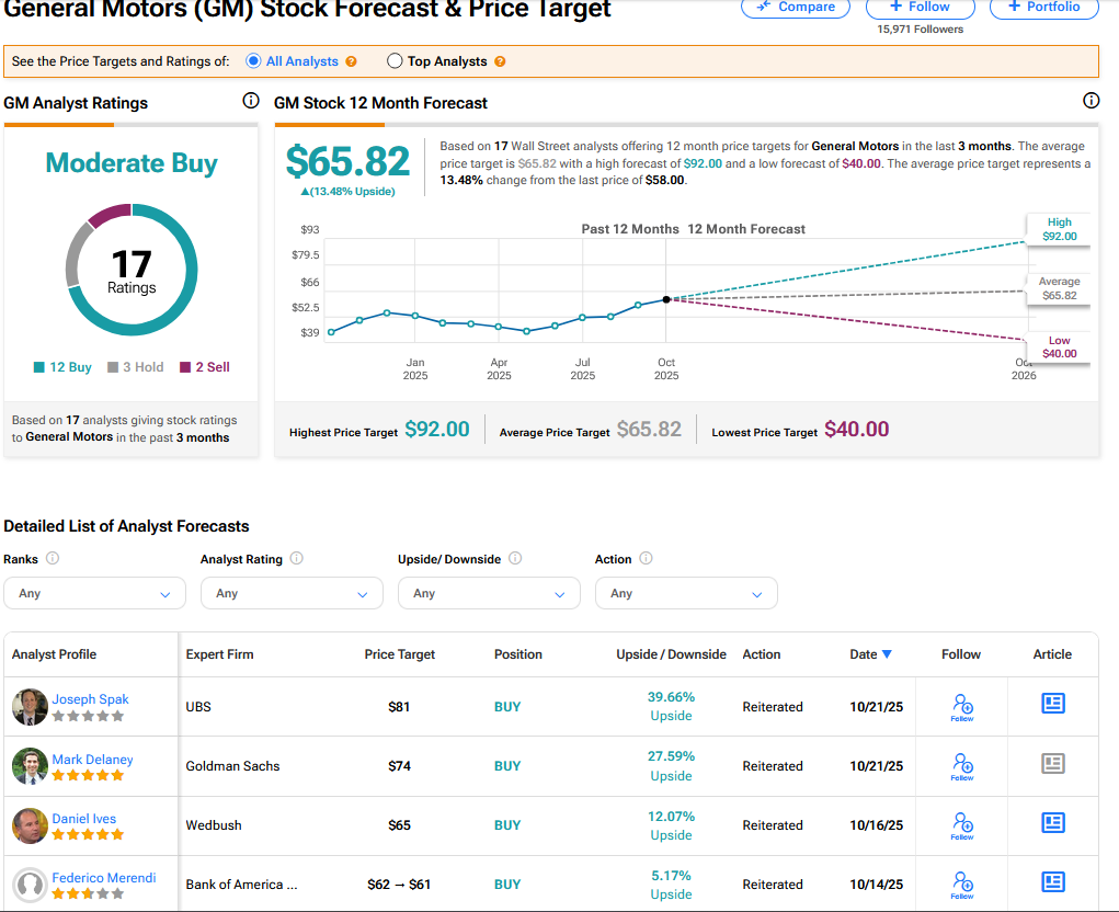팁랭크스에서 GM은 매수 12건, 보유 3건, 매도 2건을 기반으로 보통 매수 의견을 받고 있다. 최고 목표주가는 92달러다. GM 주식의 컨센서스 목표주가는 65.82달러로 13.48%의 상승 여력을 시사한다.