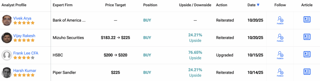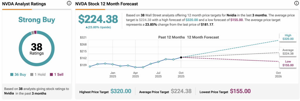 현재 월가는 지난 3개월간 38명의 애널리스트 평가를 바탕으로 엔비디아 주식에 대해 강력 매수 컨센서스를 유지하고 있다. 세부 내역은 매수 36건, 보유 1건, 매도 1건이다. 평균 12개월 NVDA 목표주가는 224.38달러로, 현재 수준에서 잠재적으로 23.85% 상승 여력을 시사한다.