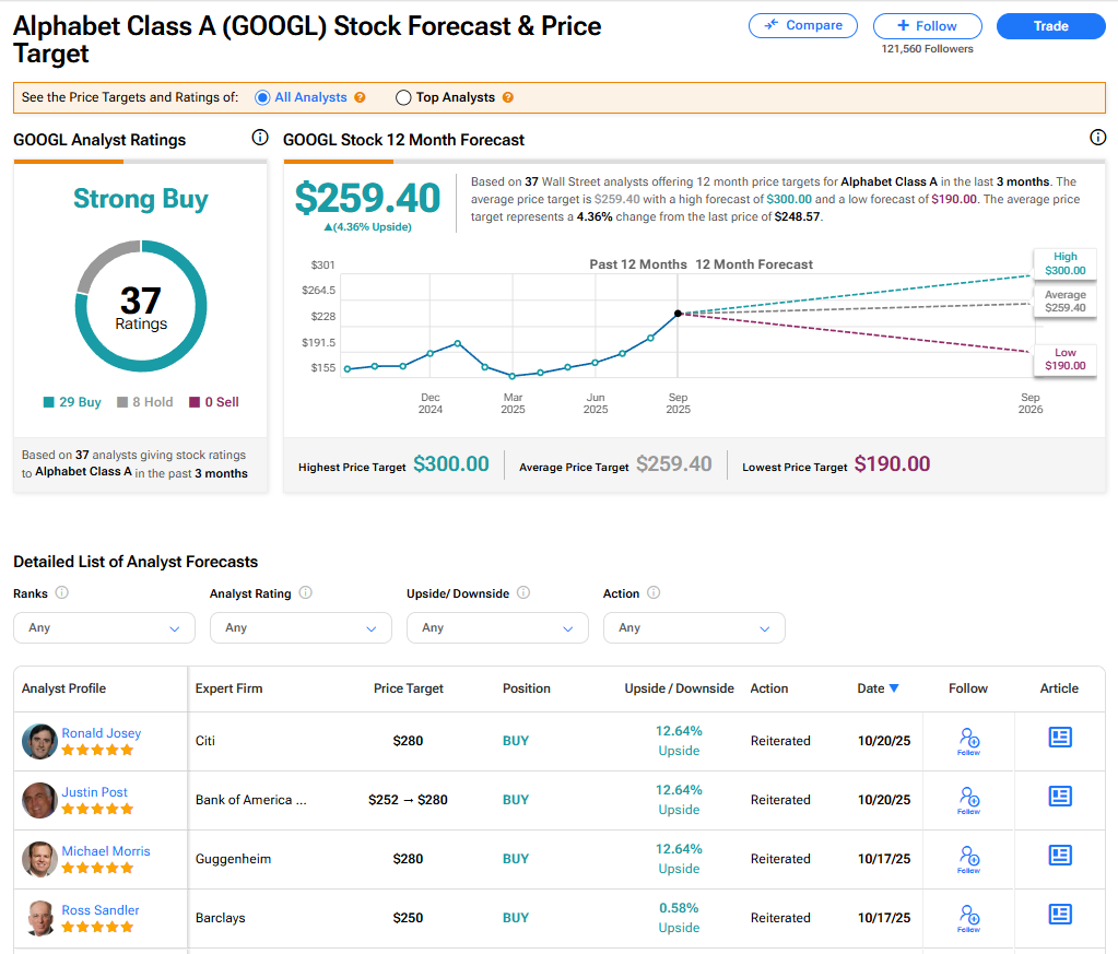알파벳 주식은 월가 애널리스트 37명 사이에서 강력 매수 컨센서스 등급을 받고 있다. 이 등급은 지난 3개월간 발표된 29건의 매수와 8건의 보유 추천에 기반한다. GOOGL의 평균 목표주가는 259.40달러로 현재 수준에서 4.36%의 상승 여력을 시사한다.