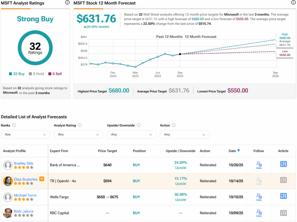 월가로 눈을 돌리면, 애널리스트들은 지난 3개월간 32건의 매수 의견을 바탕으로 MSFT 주식에 대해 강력 매수 컨센서스 등급을 부여했다. 또한, 주당 평균 MSFT 목표주가 631.76달러는 22.5%의 상승 여력을 시사한다.