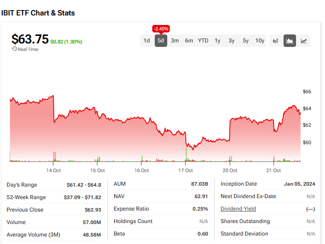 오늘 IBIT는 장중 1.03% 상승한 63.58달러를 기록했다. 주요 동인은 비트코인 가격으로, 1.23% 오른 111,928.42달러를 나타냈다.