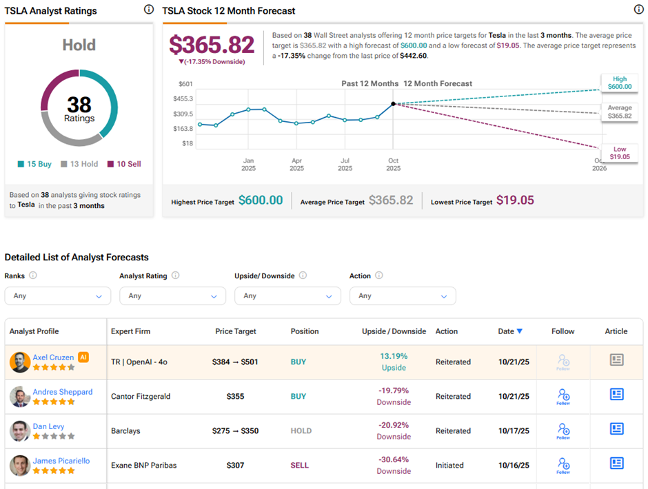 증권가는 현재 테슬라 주식에 대해 관망세를 유지하는 것을 선호한다. 팁랭크스에서 TSLA는 매수 16건, 보유 13건, 매도 10건을 기반으로 보유 컨센서스 등급을 받고 있다. 테슬라의 평균 목표주가 369.80달러는 현재 수준 대비 16.5%의 하락 여력을 시사한다. 연초 이후 TSLA 주가는 9.6% 상승했다.