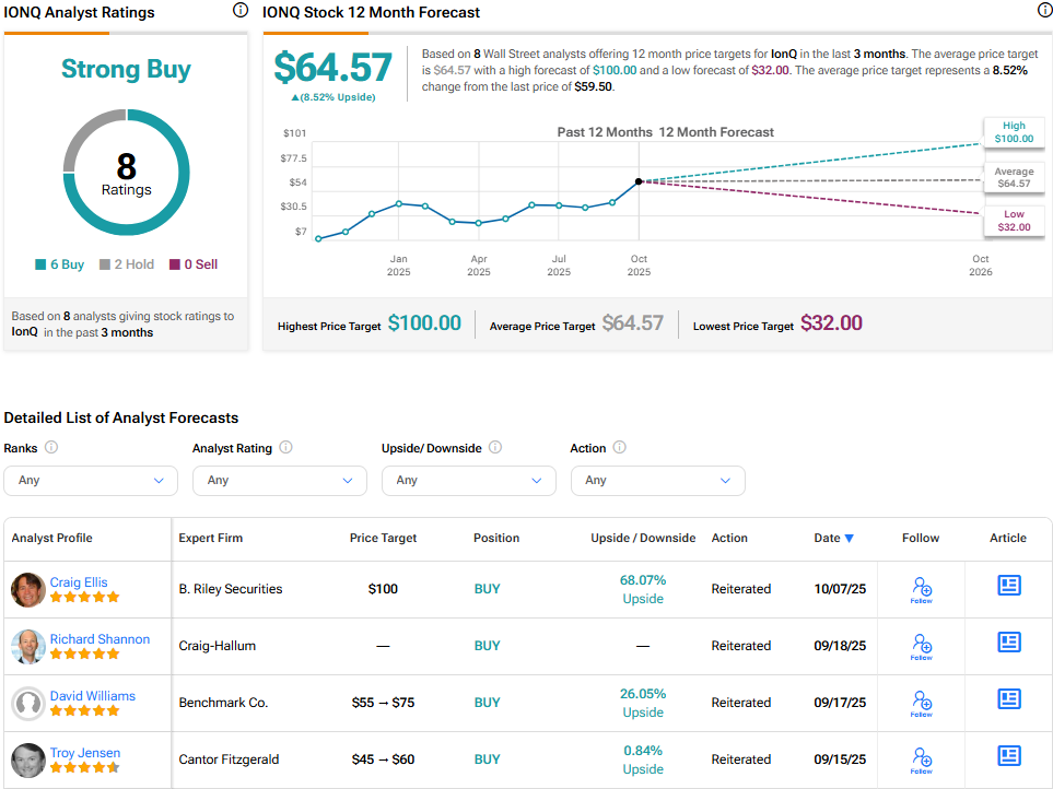 월가에서 IonQ는 8명의 애널리스트 평가를 기반으로 매수 강력 추천 의견을 받고 있다. 평균 목표주가는 64.57달러로, 현재 주가 대비 8.52% 하락 여력을 시사한다.
