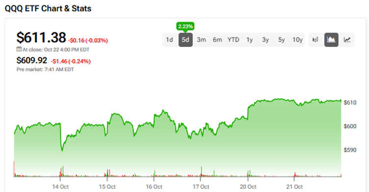 QQQ 주식은 어떻게 움직이고 있을까? 인베스코 QQQ ETF는 지난 5일간 2.23% 상승했으며, 연초 대비 20.1% 올랐다.