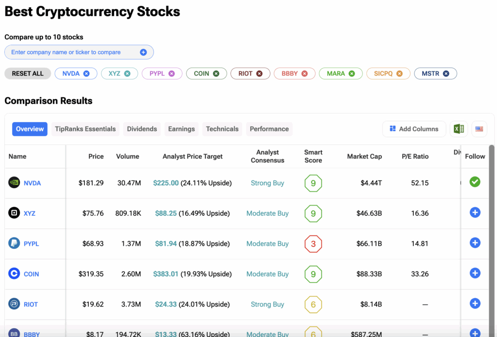 암호화폐가 주류로 더 깊이 진입함에 따라, 이 분야에 노출된 기업들은 매출 증가를 볼 수 있다. 물론 이는 비즈니스에 따라 다르지만, 투자자들에게는 지금이 자신이 선호하는 암호화폐 관련 주식의 성과를 주시할 현명한 시기다. 시장은 빠르게 변하며, 앞서 나가려면 정보를 유지해야 한다. TipRanks 암호화폐 주식 비교 도구를 사용하여 주요 암호화폐 노출 주식을 나란히 비교할 수 있다. 자세한 내용은 아래 이미지를 클릭하면 된다.