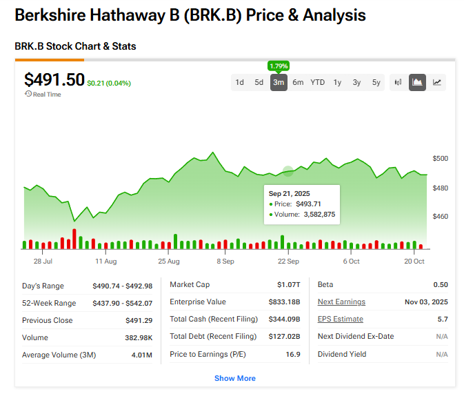 현재 버크셔 해서웨이의 보다 저렴한 클래스 B 주식에 대해 등급과 목표주가를 제시하는 애널리스트는 소수에 불과하다. 따라서 대신 주식의 3개월 성과를 살펴보겠다. 아래 차트에서 볼 수 있듯이 BRK.B 주가는 지난 12주 동안 1.79% 상승했다.
