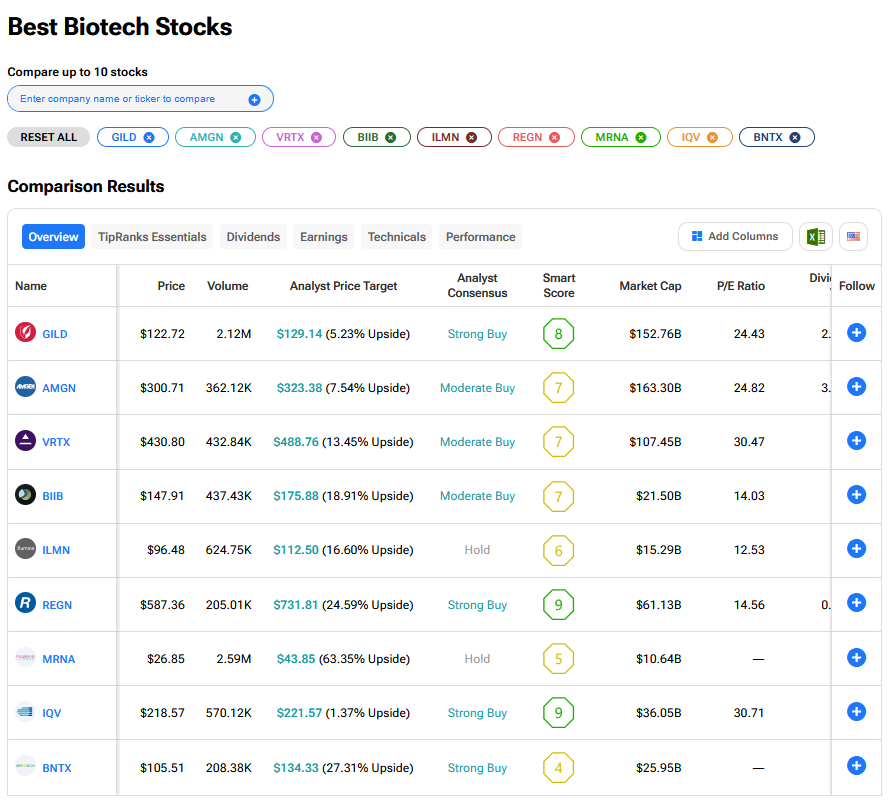 우리는 팁랭크스 비교 도구를 사용해 지금 매수하기 좋은 바이오테크 주식을 정리했다.