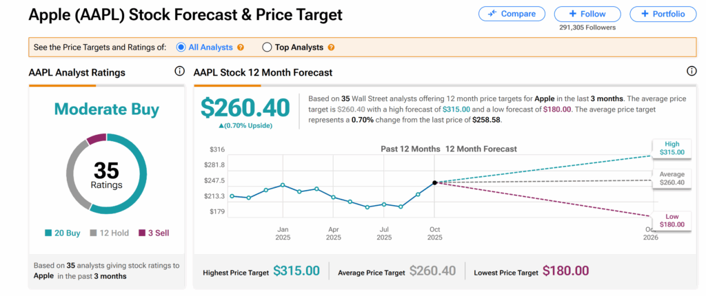 또한 평균 AAPL 목표주가 260.40달러는 현재 수준에서 0.68%의 소폭 성장 가능성을 나타낸다.