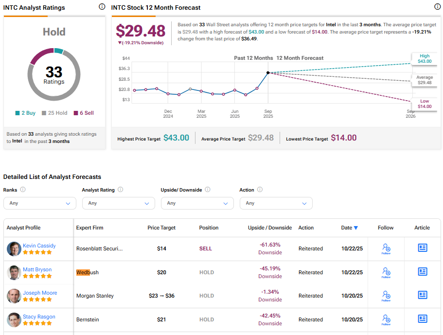 3분기 실적 발표를 앞두고, 웨드부시의 매트 브라이슨 애널리스트는 인텔 주식의 목표주가를 19달러에서 20달러로 상향 조정했지만 보유 등급을 유지했다. 이 애널리스트는 주식의 최근 밸류에이션 급등에 대해 신중한 입장이다. 동시에 그는 인텔의 다가오는 3분기 실적과 전망이 개선 조짐을 보일 것으로 예상한다.