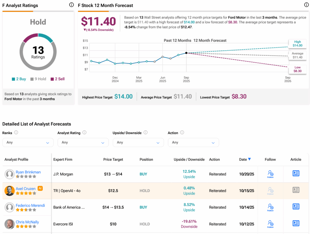 월가 애널리스트들은 F 주식에 대해 보유 의견 컨센서스 등급을 제시하고 있다. 아래 그래픽에서 볼 수 있듯이 최근 3개월간 매수 2건, 보유 9건, 매도 2건의 의견이 나왔다. 지난 1년간 주가가 13.56% 상승한 후, F 주식의 평균 목표주가는 주당 11.40달러로 8.54%의 하락 여력을 시사한다.