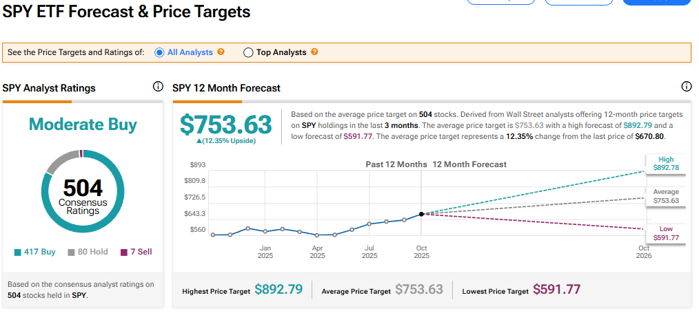 SPDR S&P 500 ETF 트러스트(SPY)는 현재 월가 애널리스트 504명 사이에서 중립적 매수 등급을 받고 있다. 이 등급은 최근 3개월간 발표된 매수 417건, 보유 80건, 매도 7건의 의견을 기반으로 한다. 평균 SPY 목표주가 753.63달러는 현재 수준 대비 12.35% 상승 여력을 시사한다.