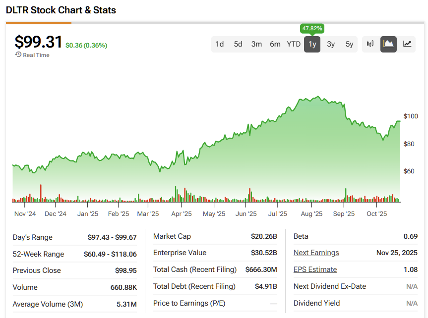 지난 12개월간 강력한 성과에도 불구하고 달러트리 주식은 여전히 매력적이며, 2026년 1월 실적 추정치 기준 단 17.2배에 거래되고 있다. 이는 현재 선행 실적 기준 22.4배에 거래되는 S&P 500 (SPX)과 비교해 유리하다.