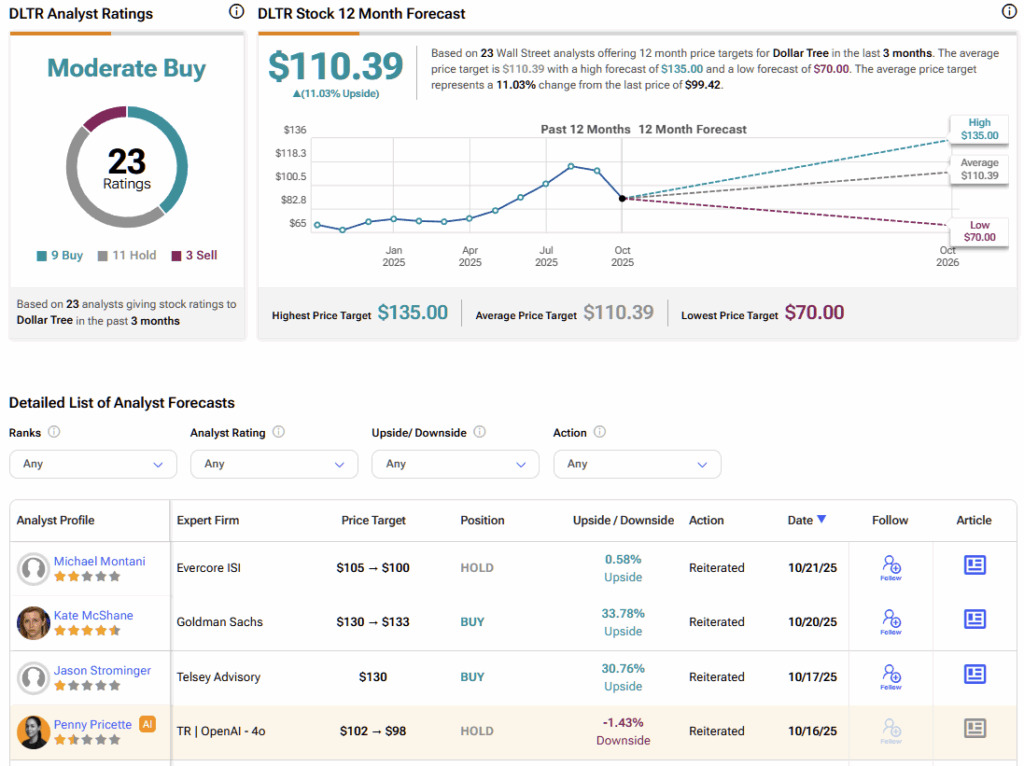 월가로 눈을 돌리면, 달러트리는 지난 3개월간 매수 9건, 보유 11건, 매도 3건의 의견을 받아 보통 매수 컨센서스 등급을 얻었다. 달러트리의 평균 목표주가 110.39달러는 향후 12개월간 11%의 상승 여력을 시사한다.