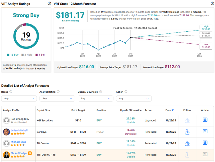 현재 월가는 버티브 홀딩스 주식에 대해 16개의 매수, 2개의 보유, 1개의 매도 추천을 기반으로 강력 매수 컨센서스 등급을 부여하고 있다. 평균 VRT 주식 목표주가인 181.17달러는 현재 수준에서 5.6%의 상승 여력을 시사한다.