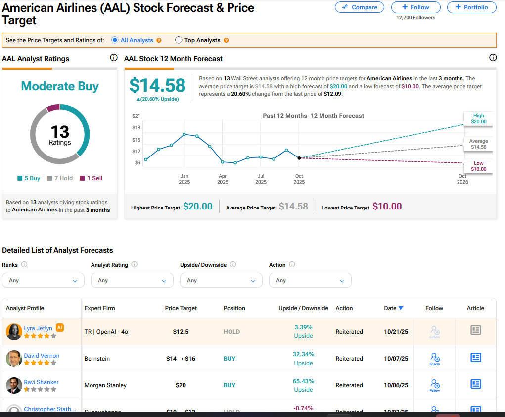 팁랭크스에서 AAL은 매수 5건, 보유 7건, 매도 1건을 기록하며 보통 매수 의견을 받고 있다. 최고 목표주가는 20달러다. AAL 주식의 컨센서스 목표주가는 14.58달러로, 20.60%의 상승 여력을 시사한다.