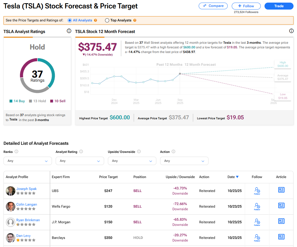 테슬라 주식은 월가 애널리스트 37명 사이에서 보유(Hold) 의견이 우세하다. 이 등급은 최근 3개월간 발표된 매수 14건, 보유 13건, 매도 10건의 의견을 기반으로 한다. 평균 TSLA 목표주가 375.47달러는 현재 수준 대비 14.47% 하락 여력을 시사한다.