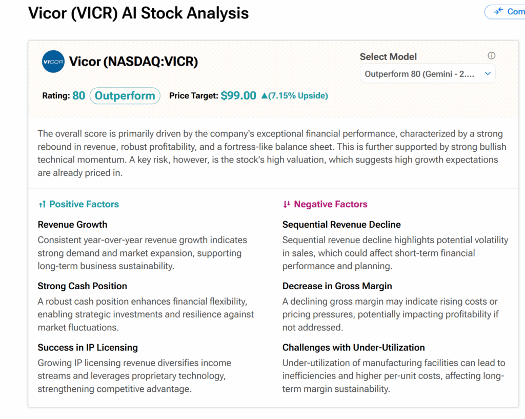최근 주식을 평가한 두 명의 애널리스트는 VICR에 90달러의 목표주가를 제시했으며, 이는 0.20%의 소폭 하락 위험을 나타낸다. 그러나 팁랭크스의 AI 주식 애널리스트 스파크는 제미니 모델의 아웃퍼폼 등급과 100점 만점에 80점을 기반으로 99달러의 목표주가를 제시했으며, 이는 약 7%의 상승 여력을 시사한다.