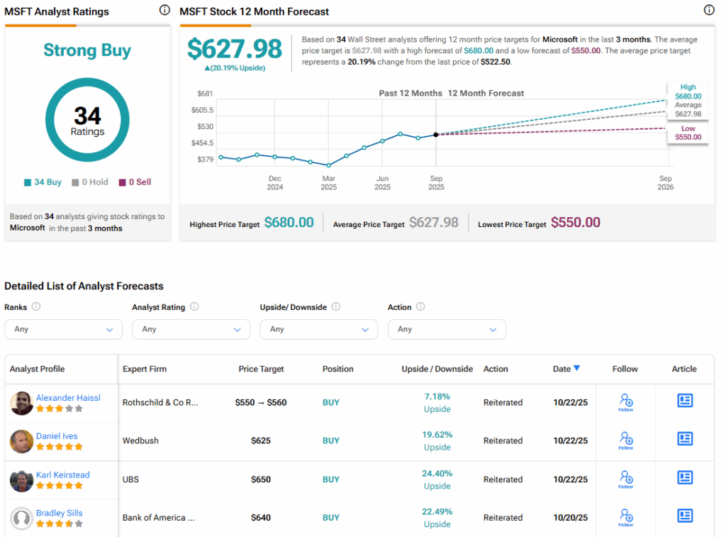 월가에서는 지난 3개월간 34건의 매수 의견을 바탕으로 마이크로소프트에 대한 증권가의 컨센서스 등급이 적극 매수다. 평균 MSFT 주가 목표가는 627.98달러로, 주가의 잠재적 상승 여력은 20.19%다.