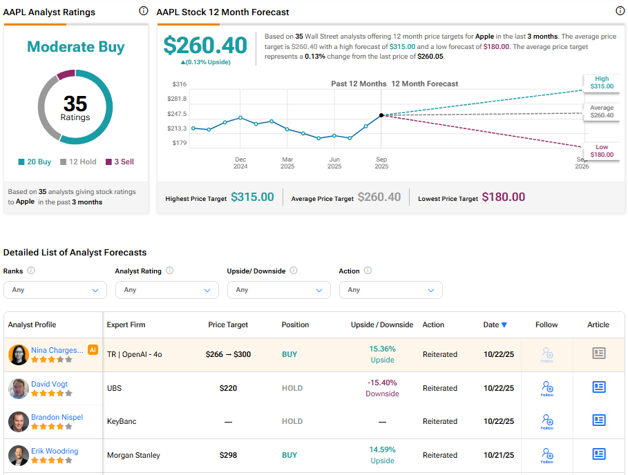 월가로 눈을 돌리면, 애플 주식은 최근 3개월간 매수 20건, 보유 12건, 매도 3건을 기록하며 보통 매수 의견을 받고 있다. 평균 애플 주가 목표가는 260.40달러로, 0.13%의 상승 여력을 시사한다.