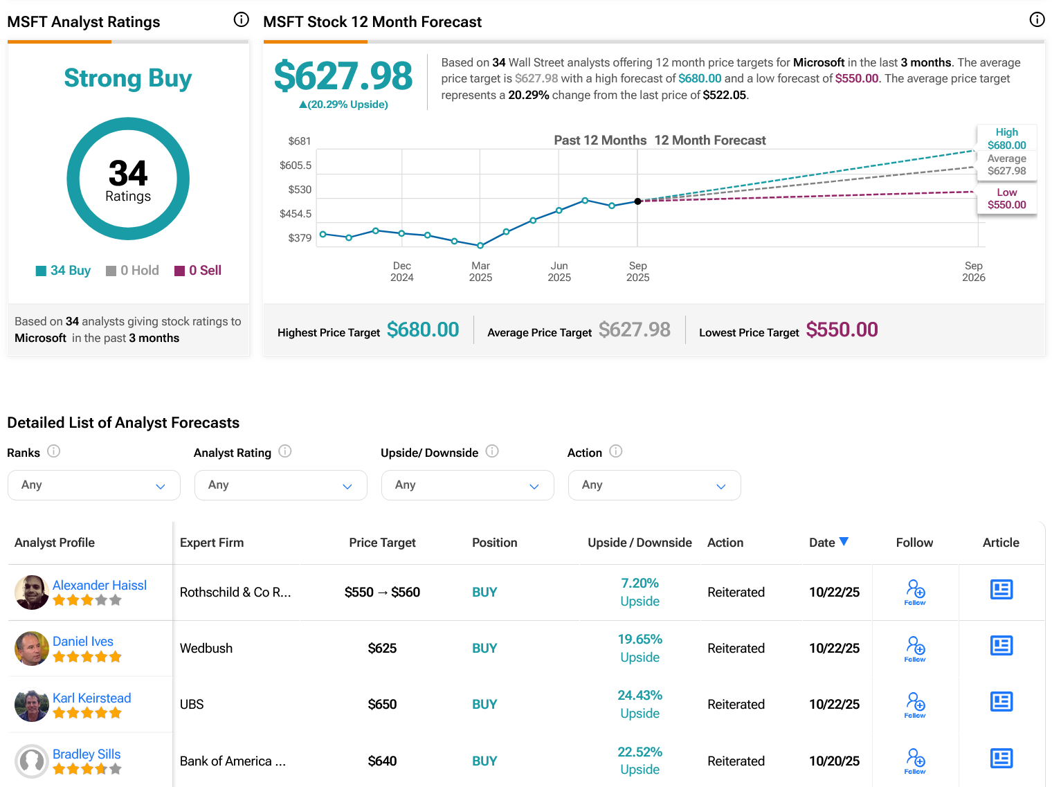 월가에서 애널리스트들은 MSFT 주식에 대해 강력 매수 컨센서스 등급을 부여하고 있다. 아래 그래픽에서 볼 수 있듯이 지난 3개월 동안 34건의 매수 의견이 제시되었다. 지난 1년 동안 주가가 22.56% 상승한 후, 주당 평균 MSFT 목표주가 627.98달러는 20.29%의 상승 여력을 시사한다.