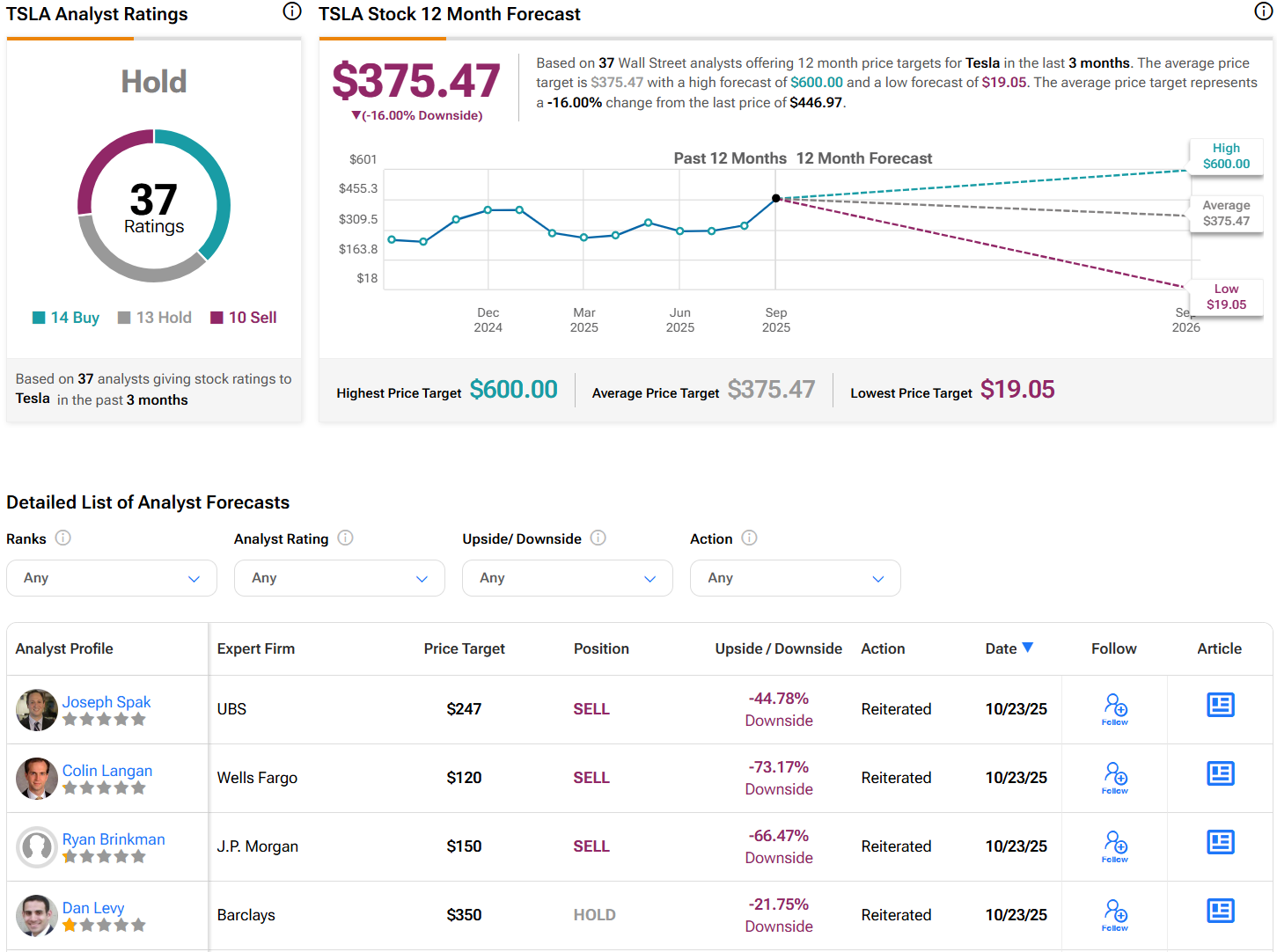 월가를 살펴보면, 애널리스트들은 테슬라 주식에 대해 보유 의견을 제시하고 있다. 지난 3개월간 매수 14건, 보유 13건, 매도 10건이 나왔다. 또한 테슬라의 평균 목표주가는 주당 375.47달러로 16%의 하락 여력을 시사한다.