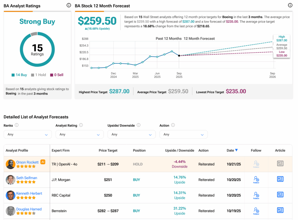월가를 살펴보면, 애널리스트들은 BA 주식에 대해 강력 매수 컨센서스 등급을 부여하고 있다. 아래 그래픽에서 볼 수 있듯이 지난 3개월간 14건의 매수와 1건의 보유 의견이 나왔다. 지난 1년간 주가가 39.56% 상승한 후, 평균 BA 목표주가는 주당 259.50달러로 18.68%의 상승 여력을 시사한다.