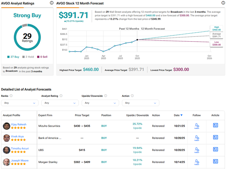 현재 월가는 브로드컴 주식에 대해 27개의 매수와 2개의 보유 의견을 바탕으로 강력 매수 컨센서스 등급을 부여하고 있다. AVGO 주식 평균 목표가 391.71달러는 현재 수준에서 13.2%의 상승 여력을 시사한다.