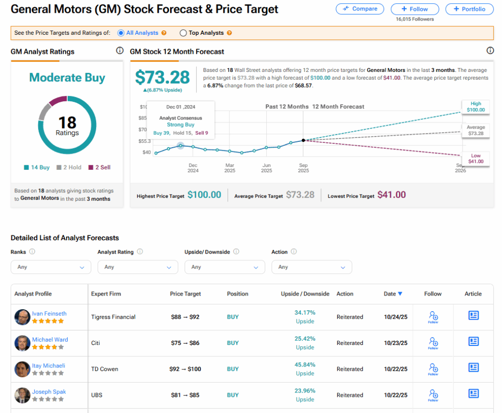 제너럴모터스 주식은 18명의 월가 애널리스트들 사이에서 보통 매수 등급의 컨센서스를 받고 있다. 이 등급은 지난 3개월 동안 발표된 14건의 매수, 2건의 보유, 2건의 매도 의견을 기반으로 한다. GM의 평균 목표주가는 73.28달러로 현재 수준에서 6.87%의 상승 여력을 시사한다.