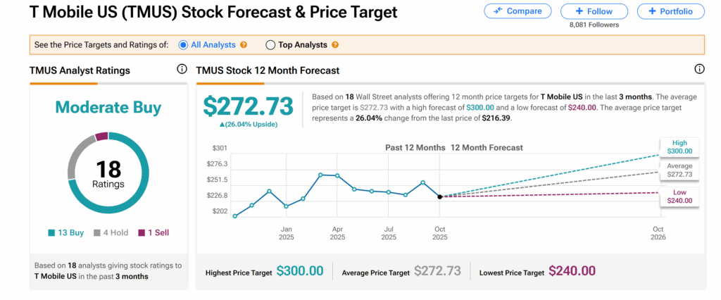 또한 평균 TMUS 목표주가는 272.73달러로 현재 수준 대비 26%의 상승 잠재력을 시사한다.