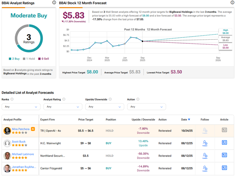 전반적으로 BigBear.ai Holdings 주식은 2개의 매수와 1개의 보유 추천을 기반으로 보통 매수 컨센서스 등급을 받고 있다. 평균 BBAI 주가 목표인 5.83달러는 17.3%의 하락 위험을 나타낸다.