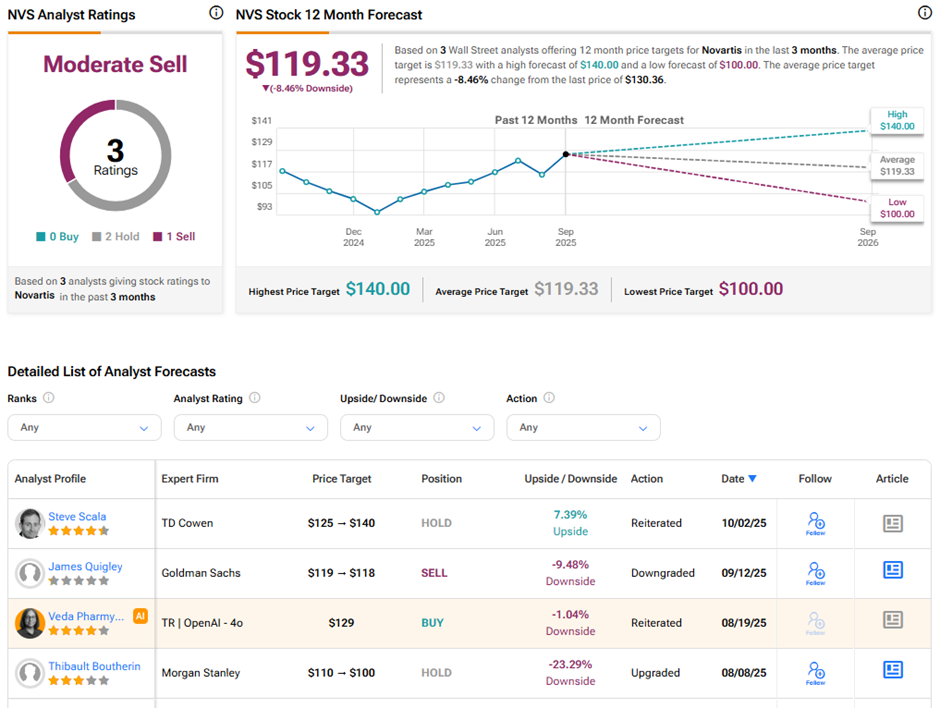 팁랭크스에서 NVS 주식은 2개의 보유 의견과 1개의 매도 의견을 바탕으로 보통 매도 컨센서스 등급을 받고 있다. 노바티스의 평균 목표주가 119.33달러는 현재 수준 대비 8.5% 하락 여력을 시사한다. 연초 대비 NVS 주식은 38% 상승했다.