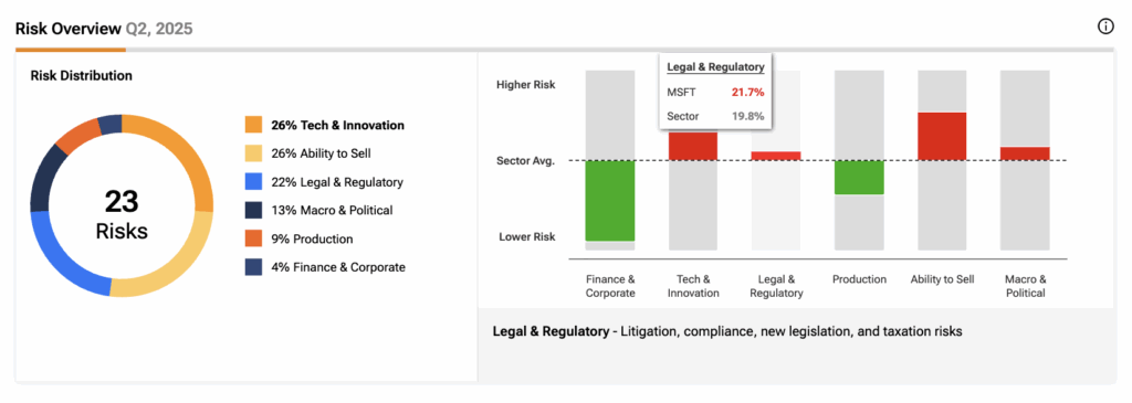 팁랭크스의 리스크 분석 도구에 따르면, 법적 및 규제 문제는 2025년 2분기 마이크로소프트의 전체 리스크 프로필에서 21.7%를 차지했다. 이는 업계 평균인 19.8%보다 현저히 높은 수치로, 회사의 사업 관행에 대한 감독이 강화되고 있음을 나타낸다.