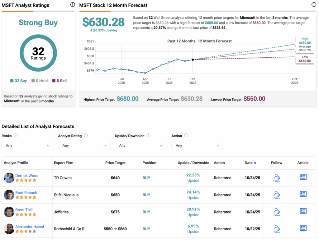 팁랭크스에 따르면, MSFT 주식은 32명의 월가 애널리스트들 사이에서 적극 매수 컨센서스 등급을 받고 있으며, 최근 3개월 동안 모두 매수 추천을 받았다. 평균 마이크로소프트 주가 목표가인 630.285달러는 현재 수준에서 20.4%의 상승 여력을 시사한다.